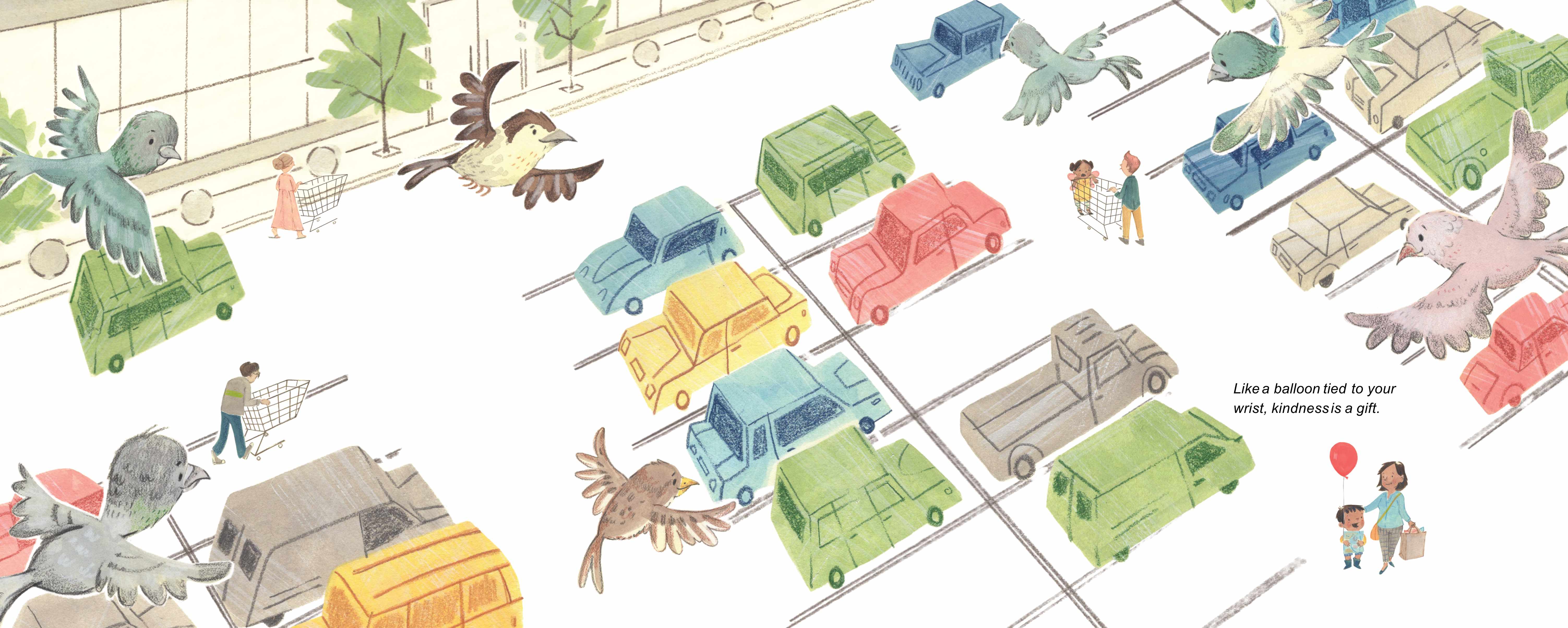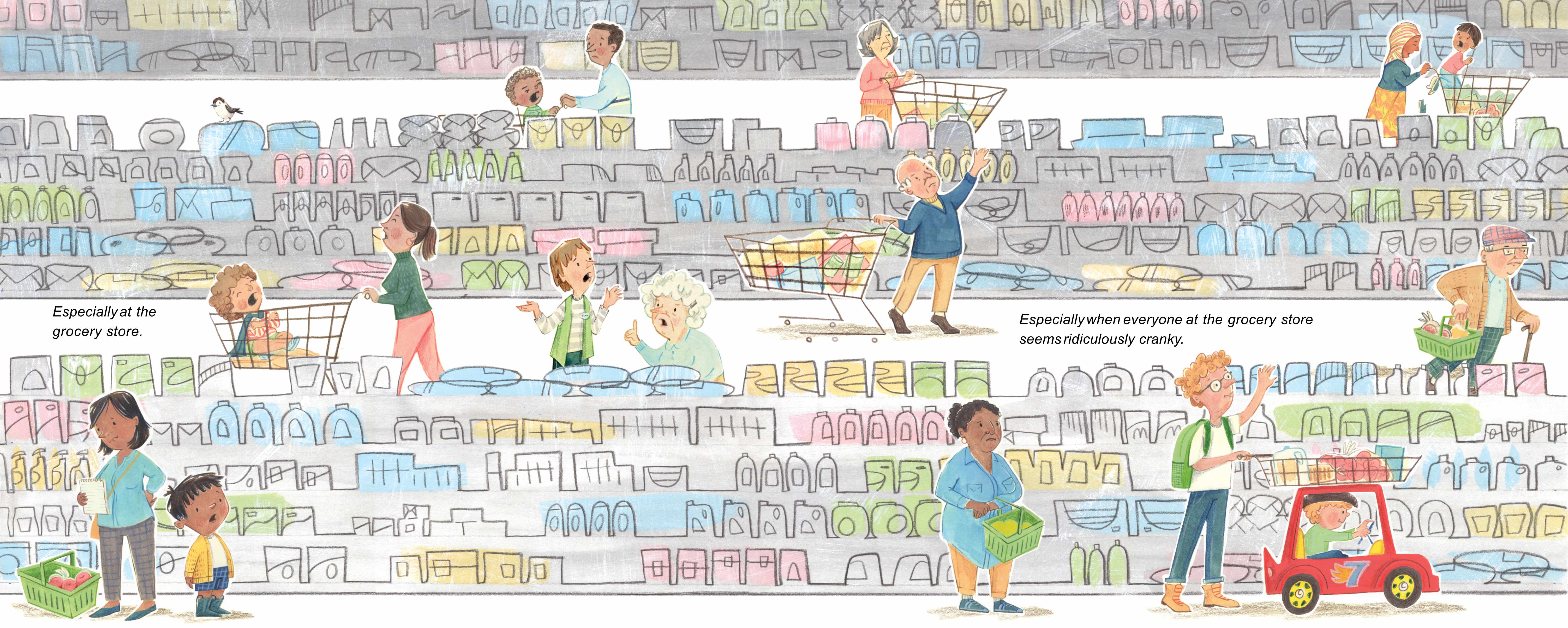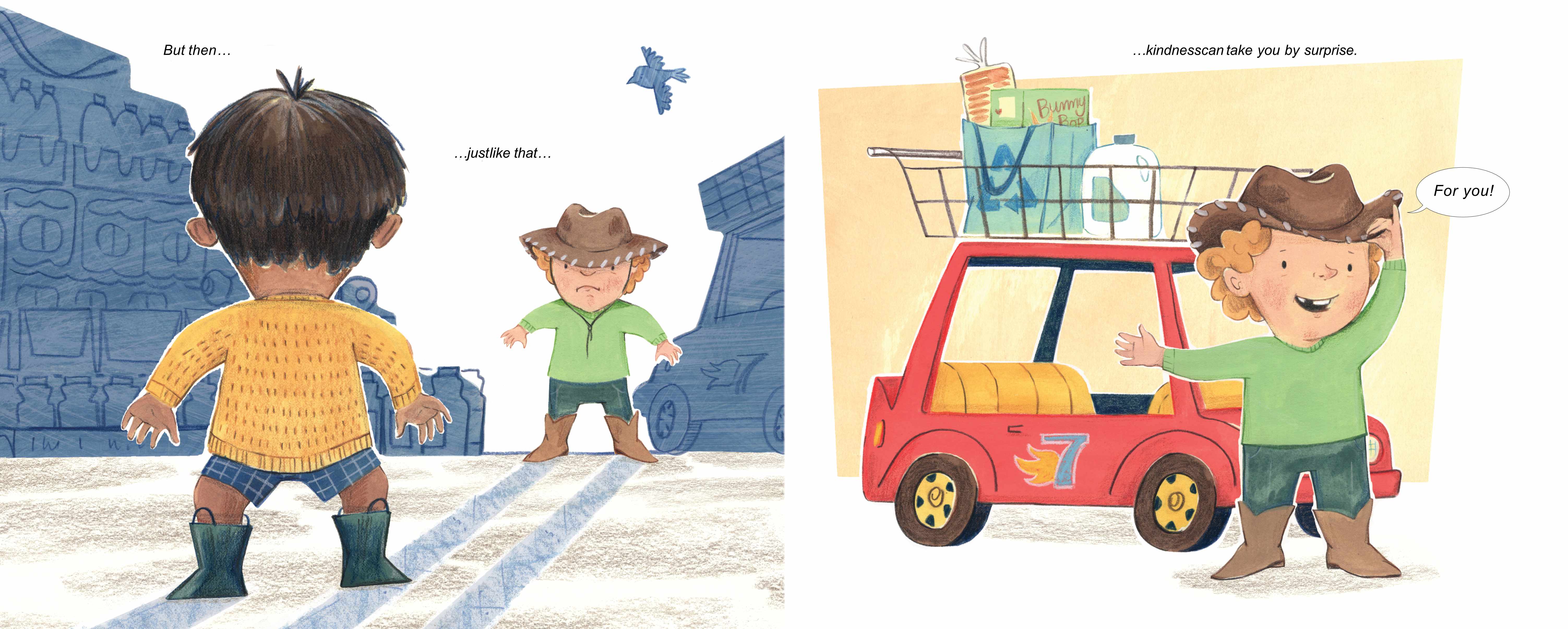“Sometimes, being kind requires a little more oomph. Especially at the grocery store when everyone seems to be in a bad mood, and the car cart you wanted is already taken. But sometimes kindness can take you by surprise. Suddenly, the kid with the car cart yields his ride, and that small act changes everything. If crankiness is catching, kindness can be just as infectious. As one child shows kindness to others, he watches how his kindness spreads and grows, with one kindness leading to another throughout the store.“